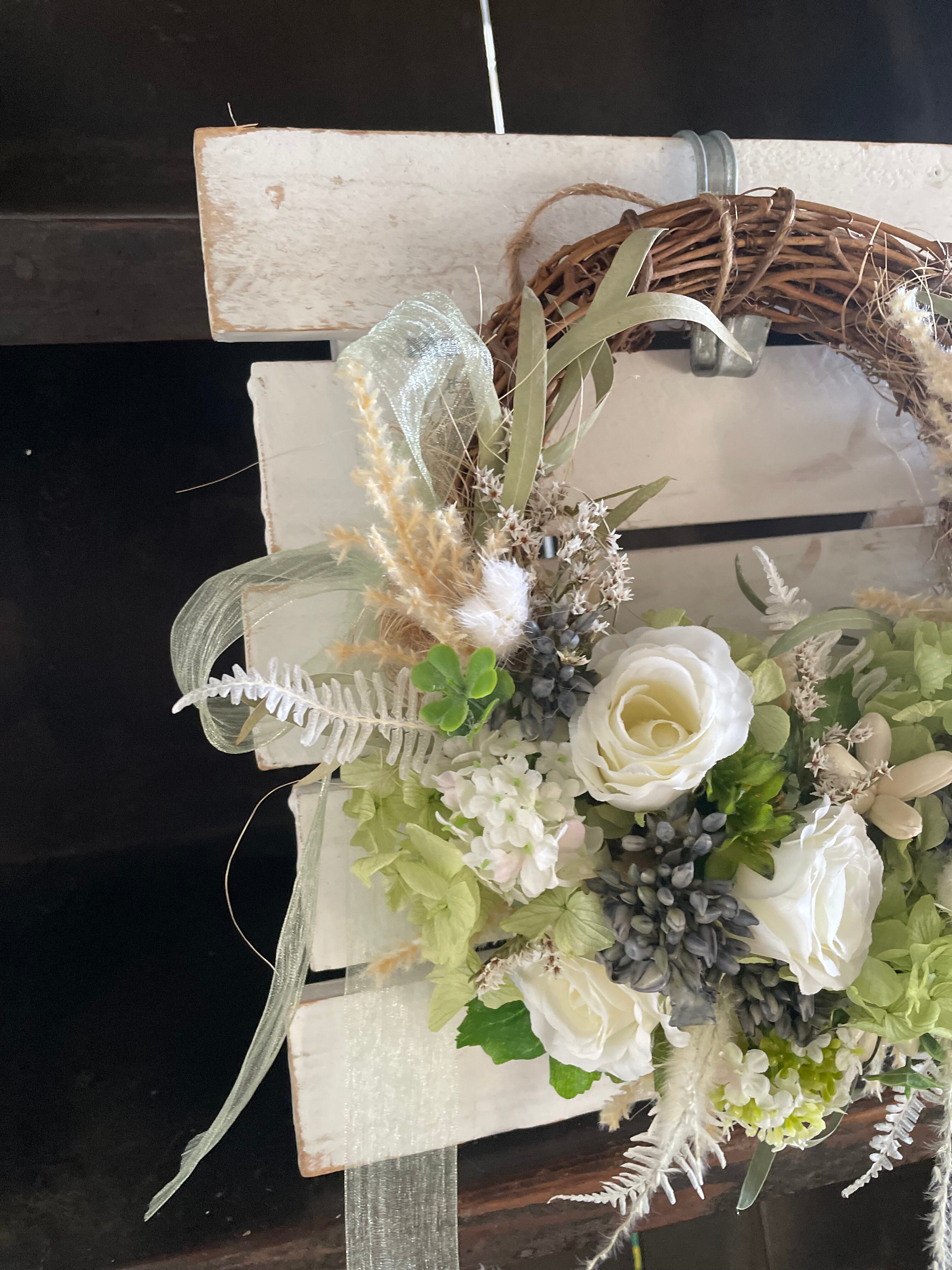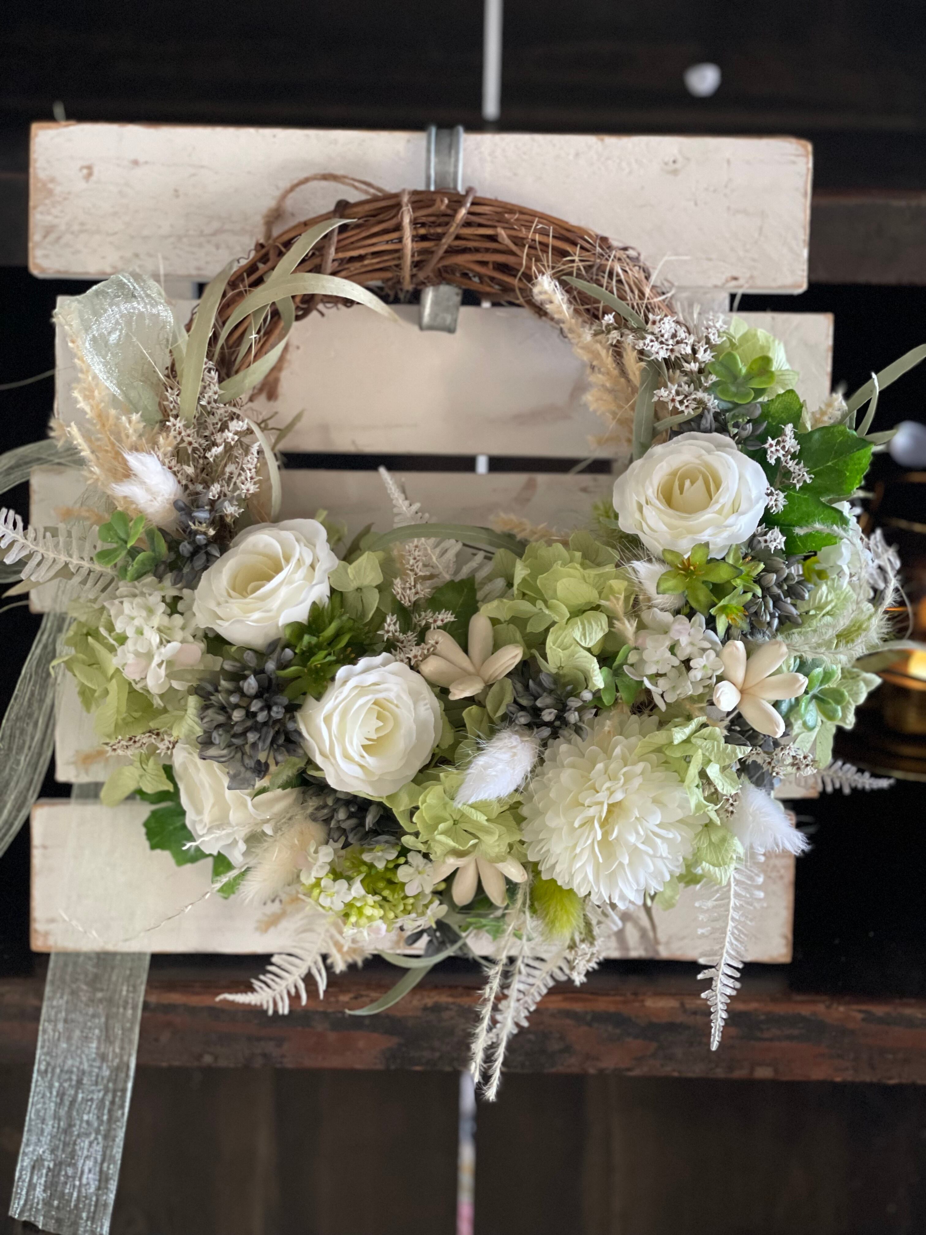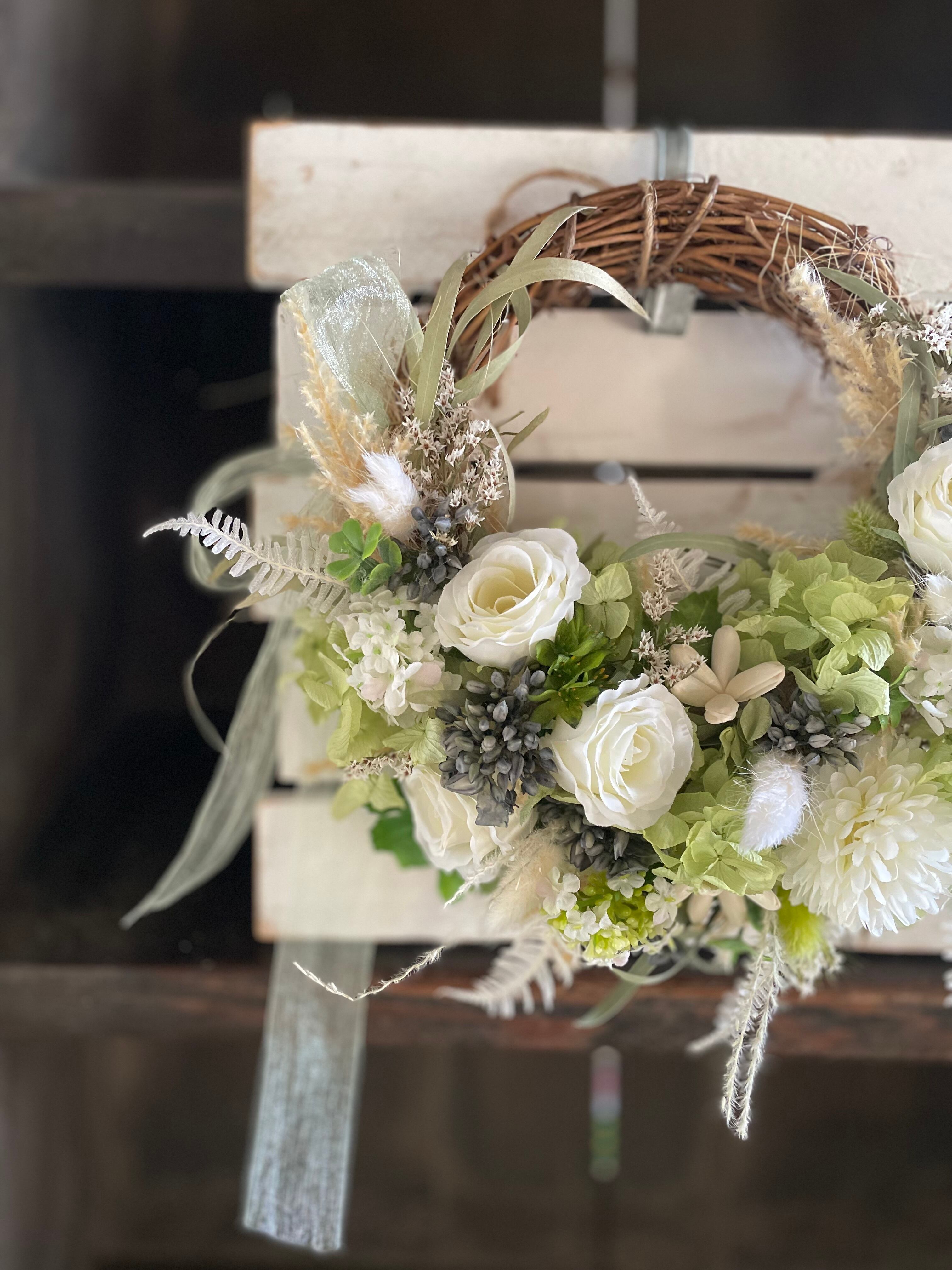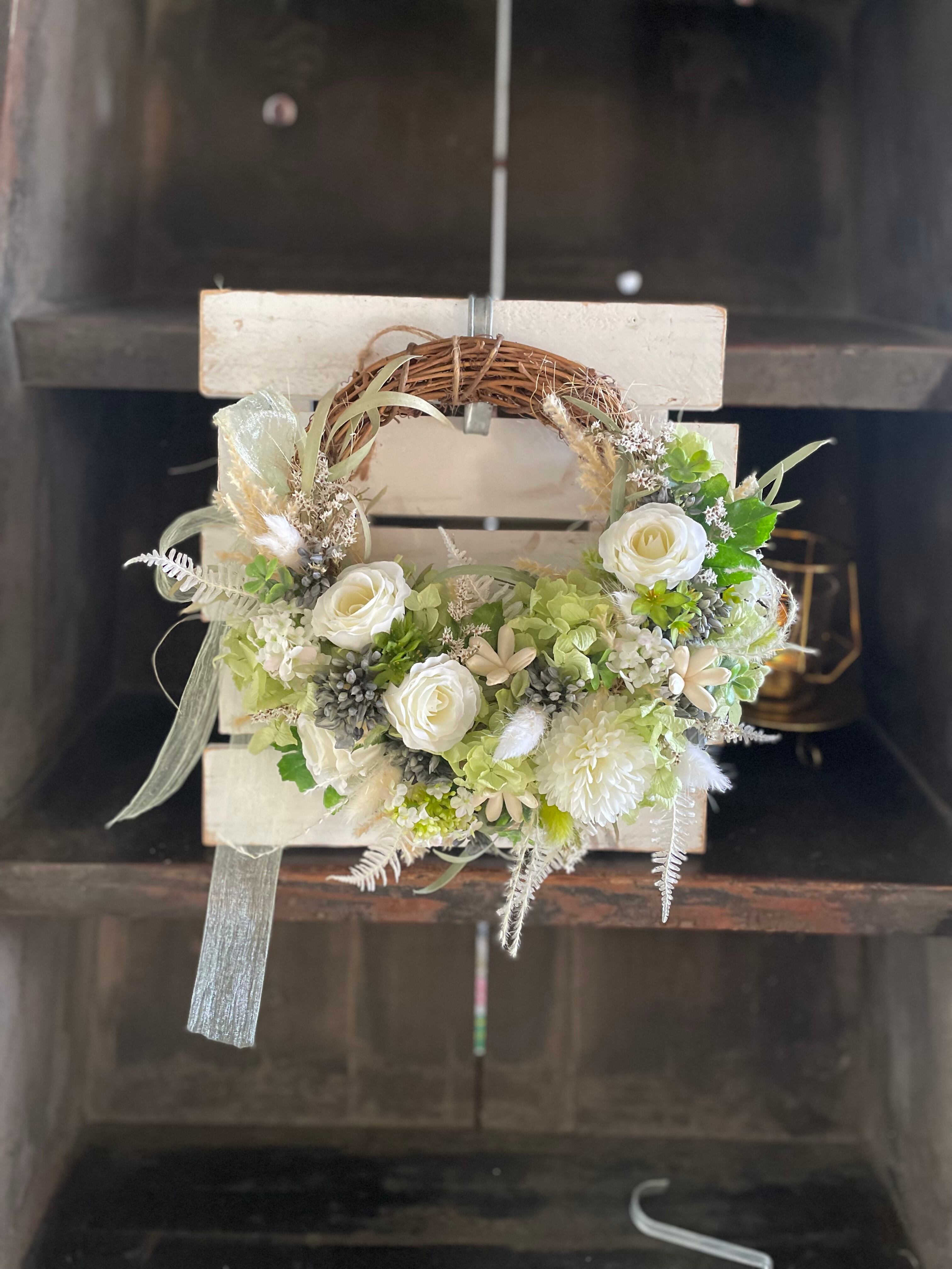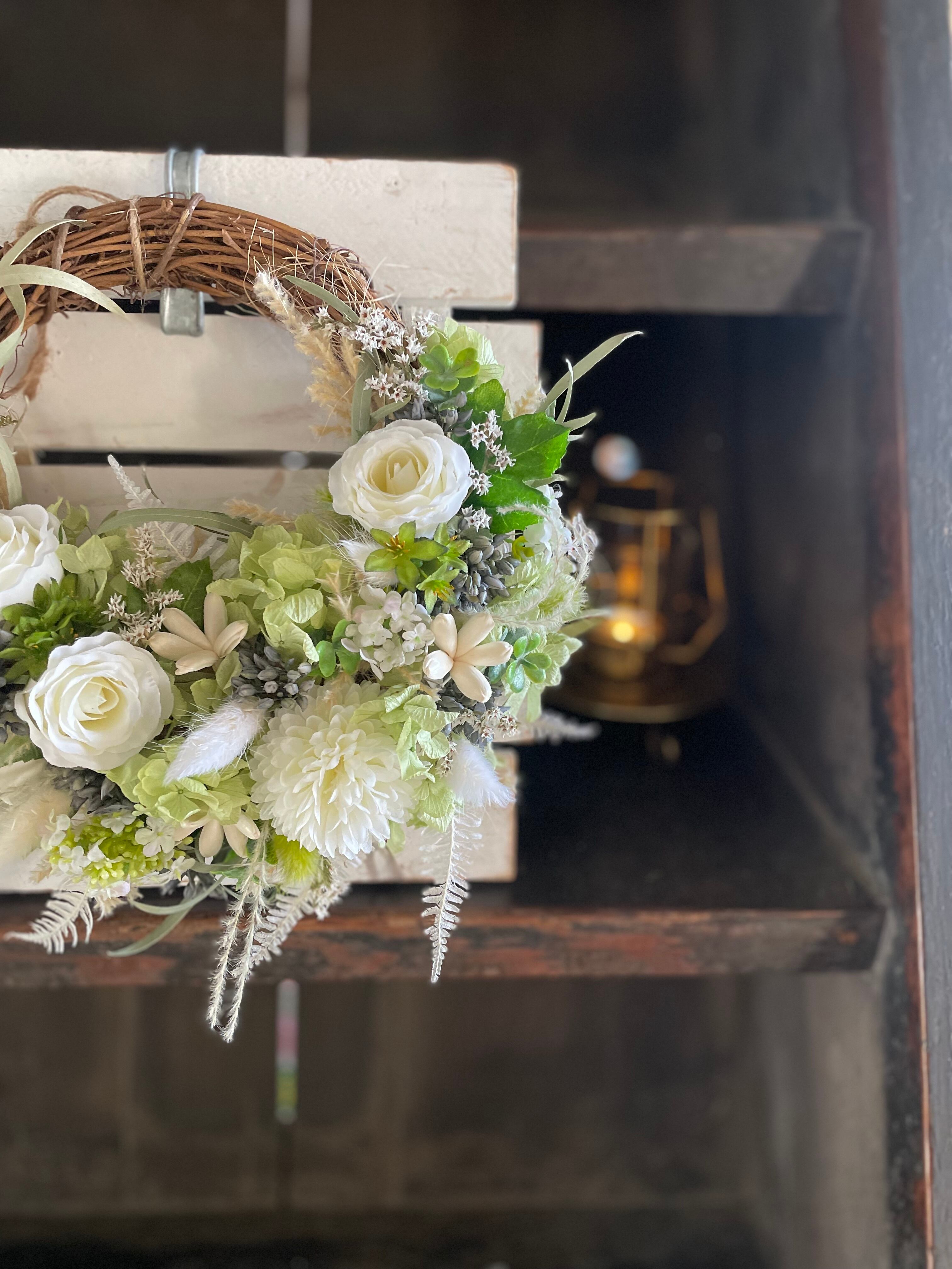 こちらはアーティフィシャルフラワーを使用し作成したリースです。