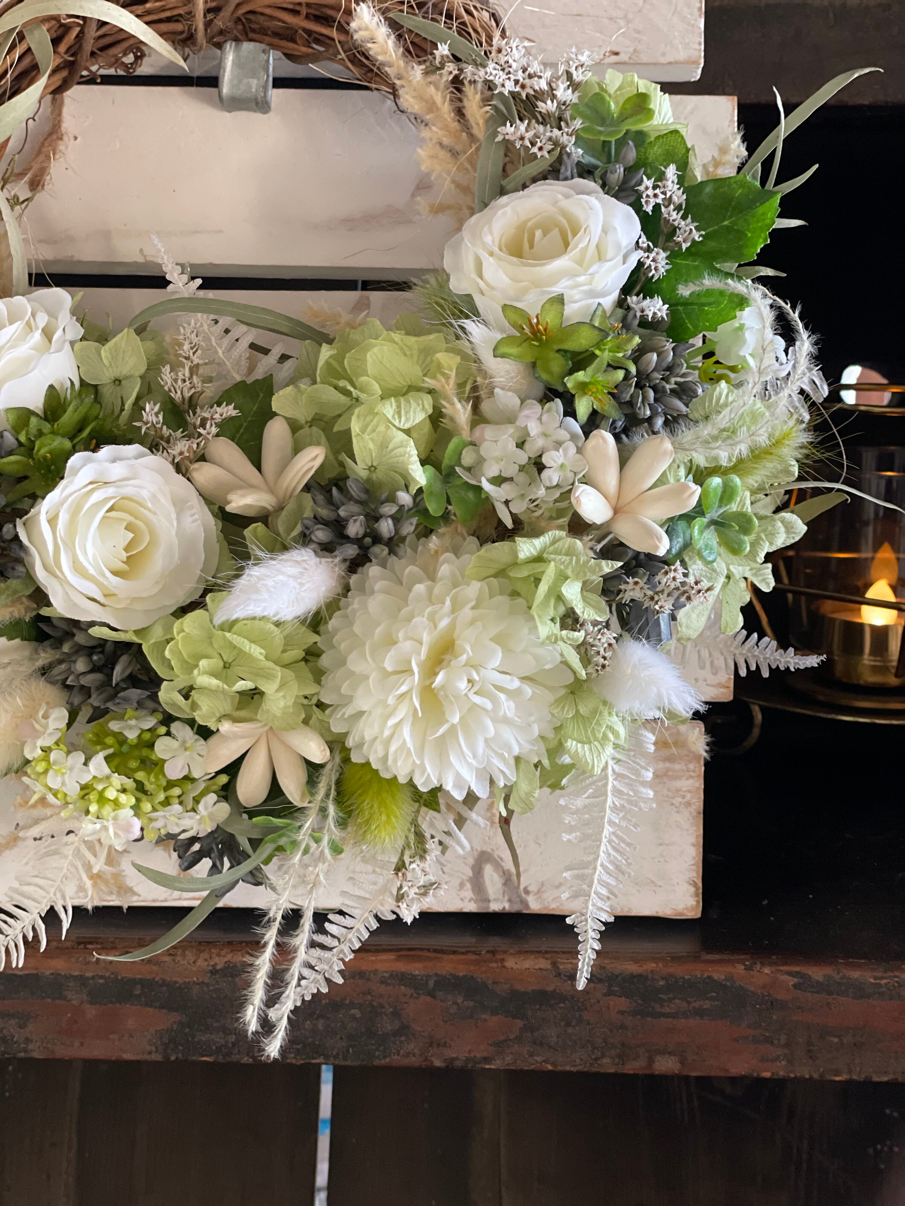 外玄関でも飾れるように大きめのサイズ感にしています。明るい色で纏めていますので玄関ドアの色が落ち着いた色合いだと似合います。