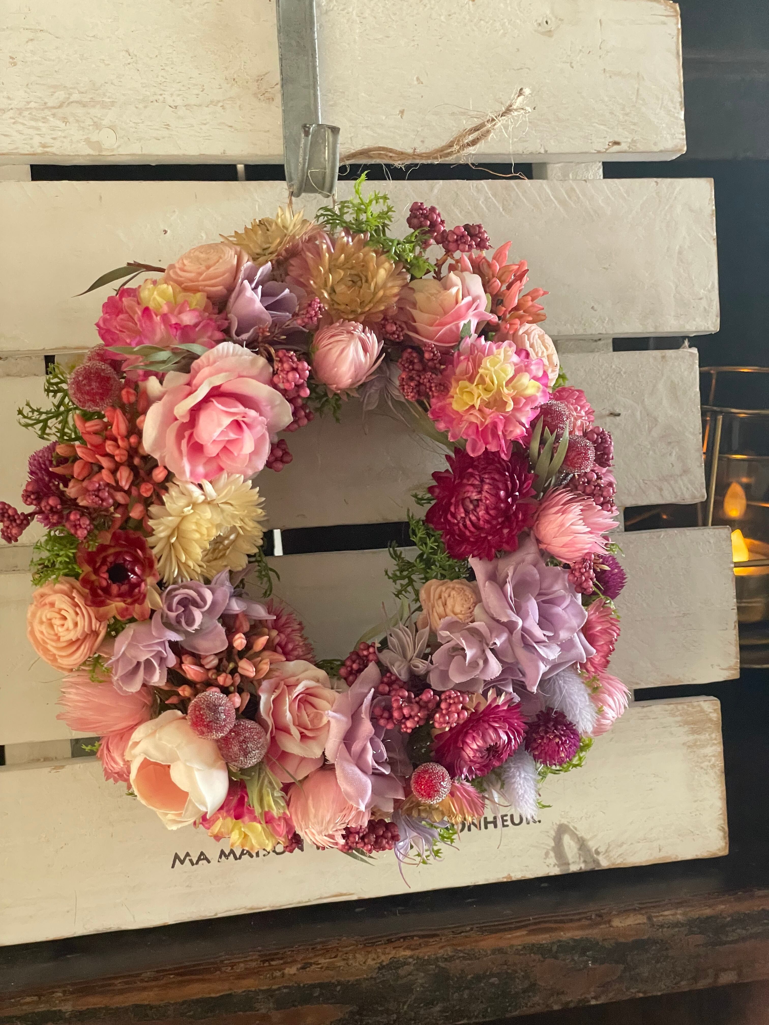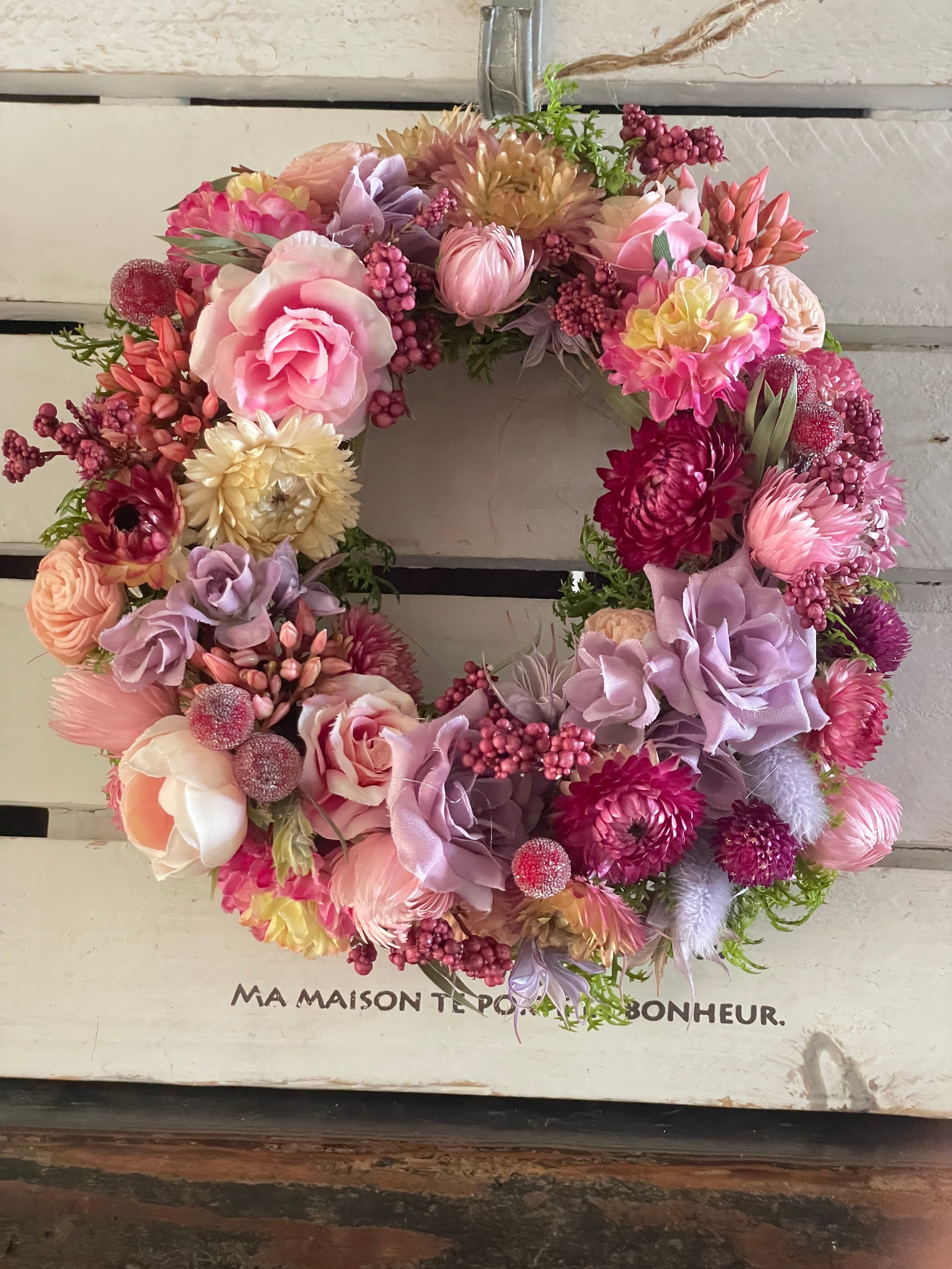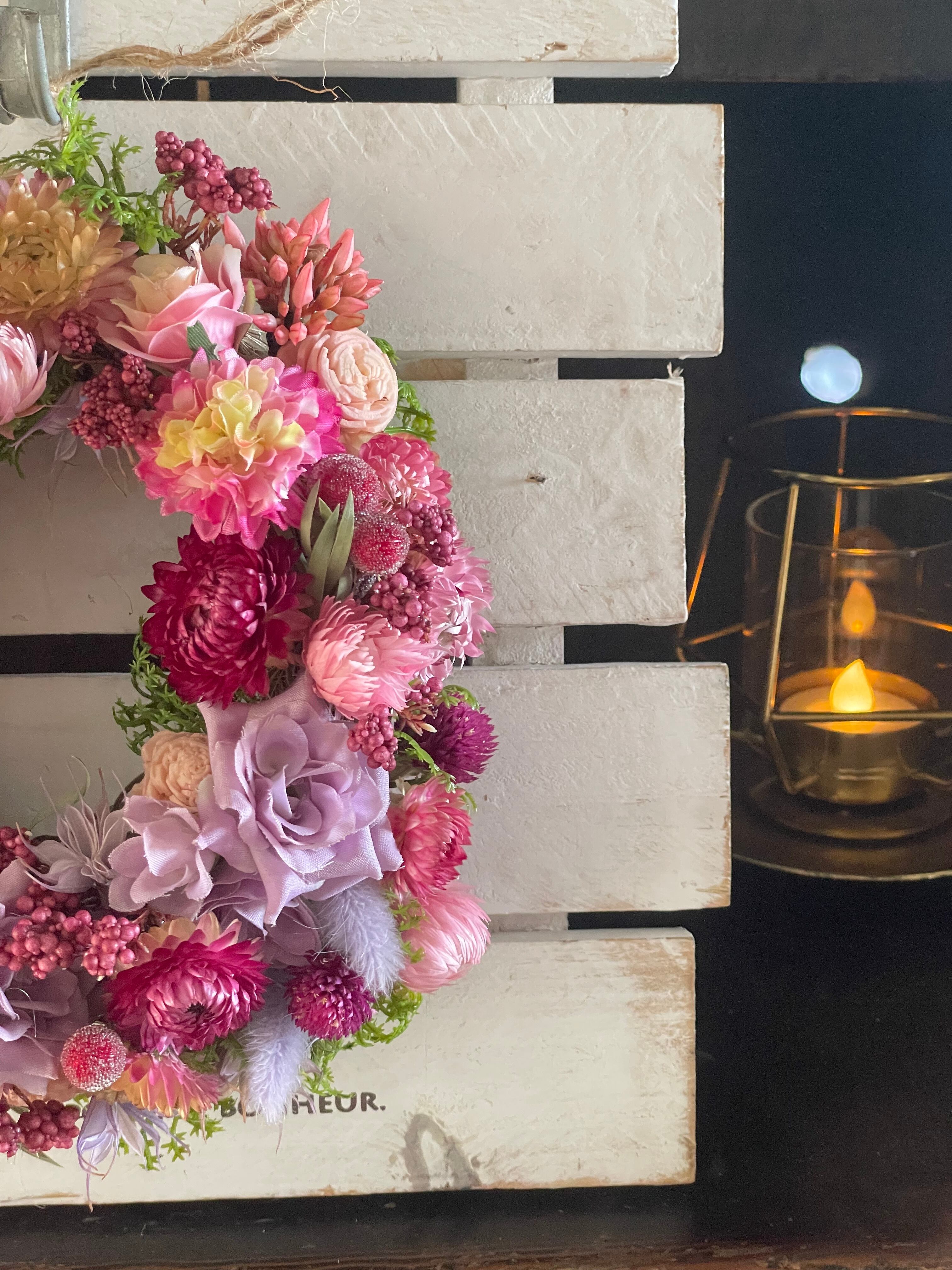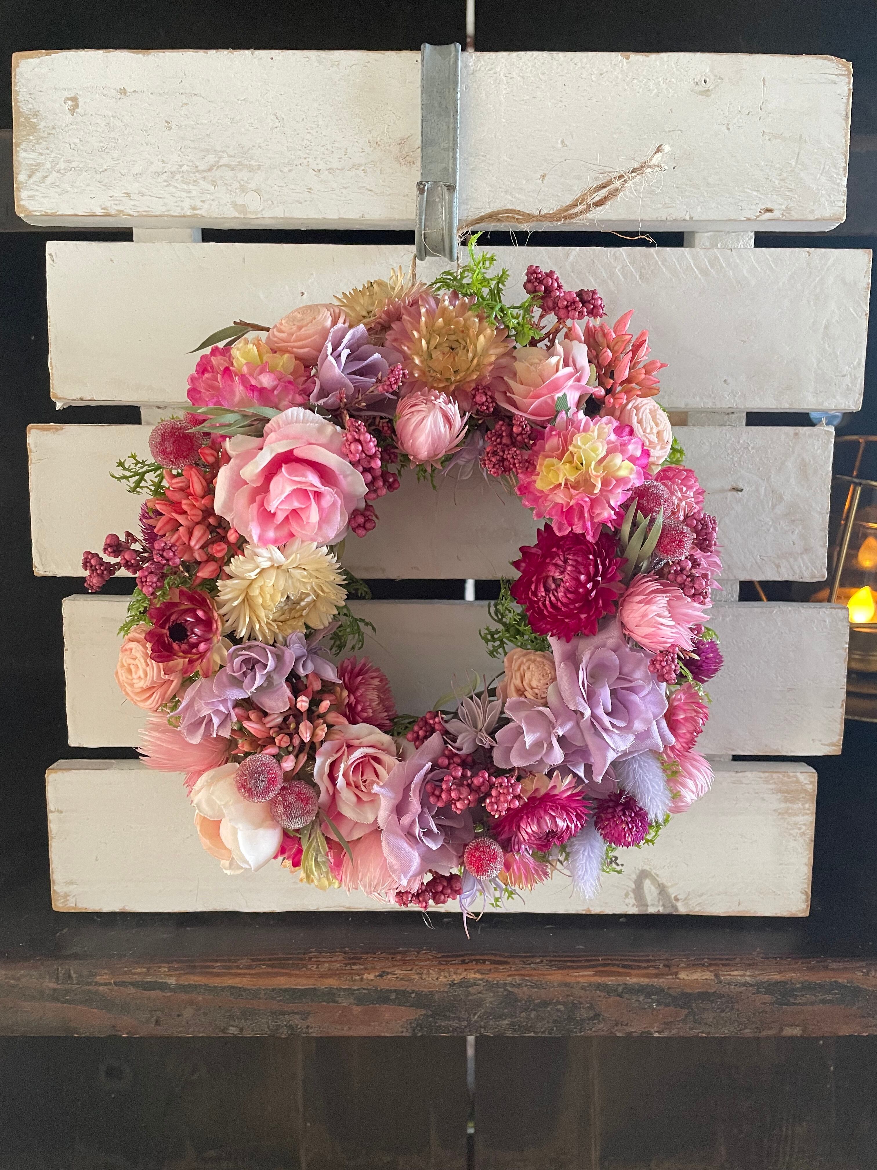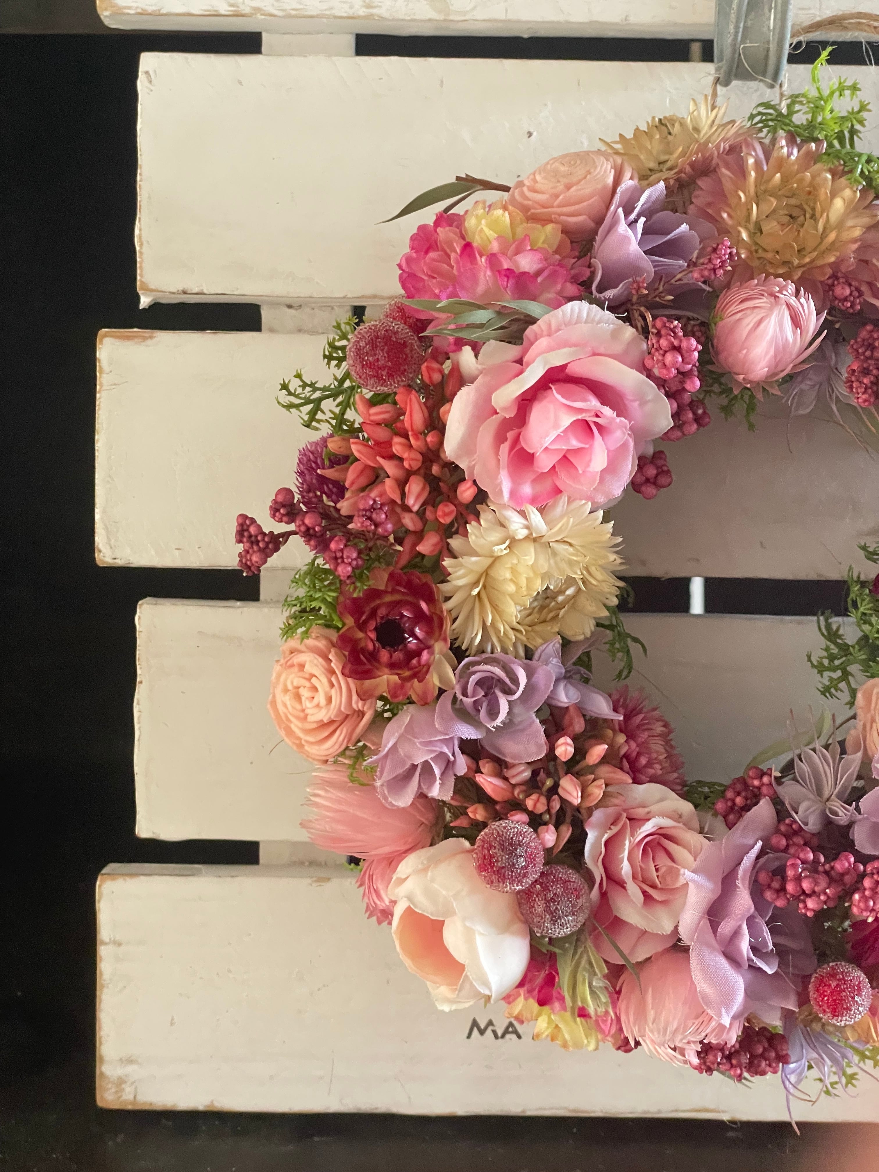 沢山の種類の花が調和して一つの音楽を奏でるように、ピンクと淡い紫のグラデーションカラーにしました。