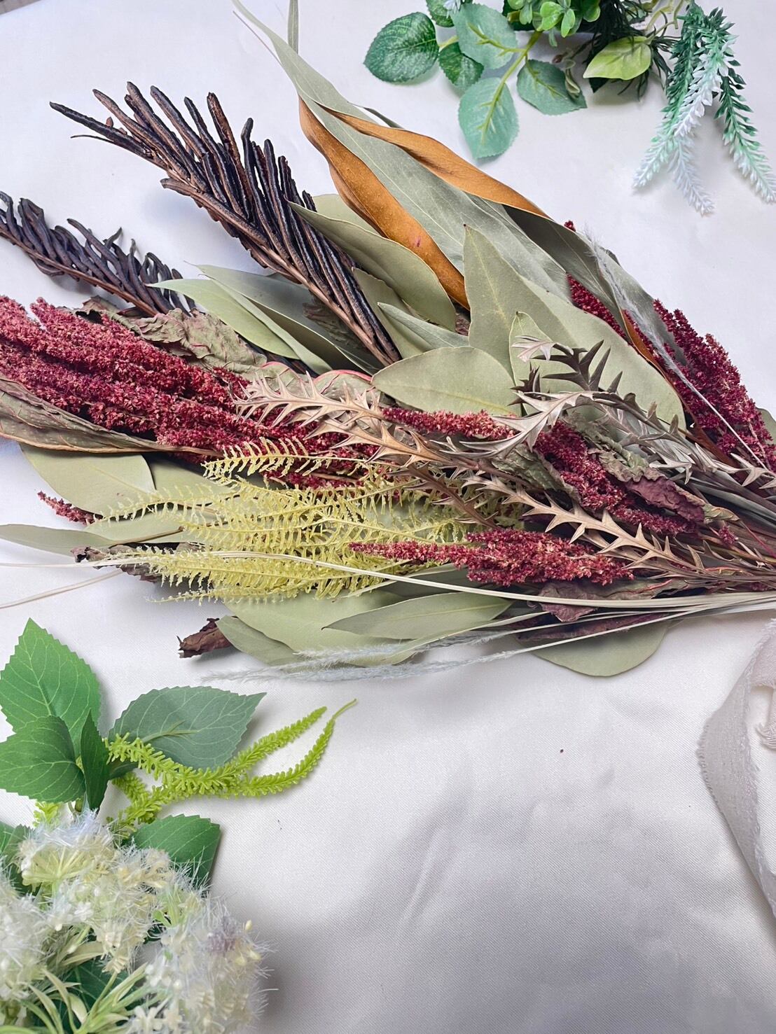 グンソク、山シダ、アマランサス、グレビレアゴールド、バンクシア、ユーカリウイロー