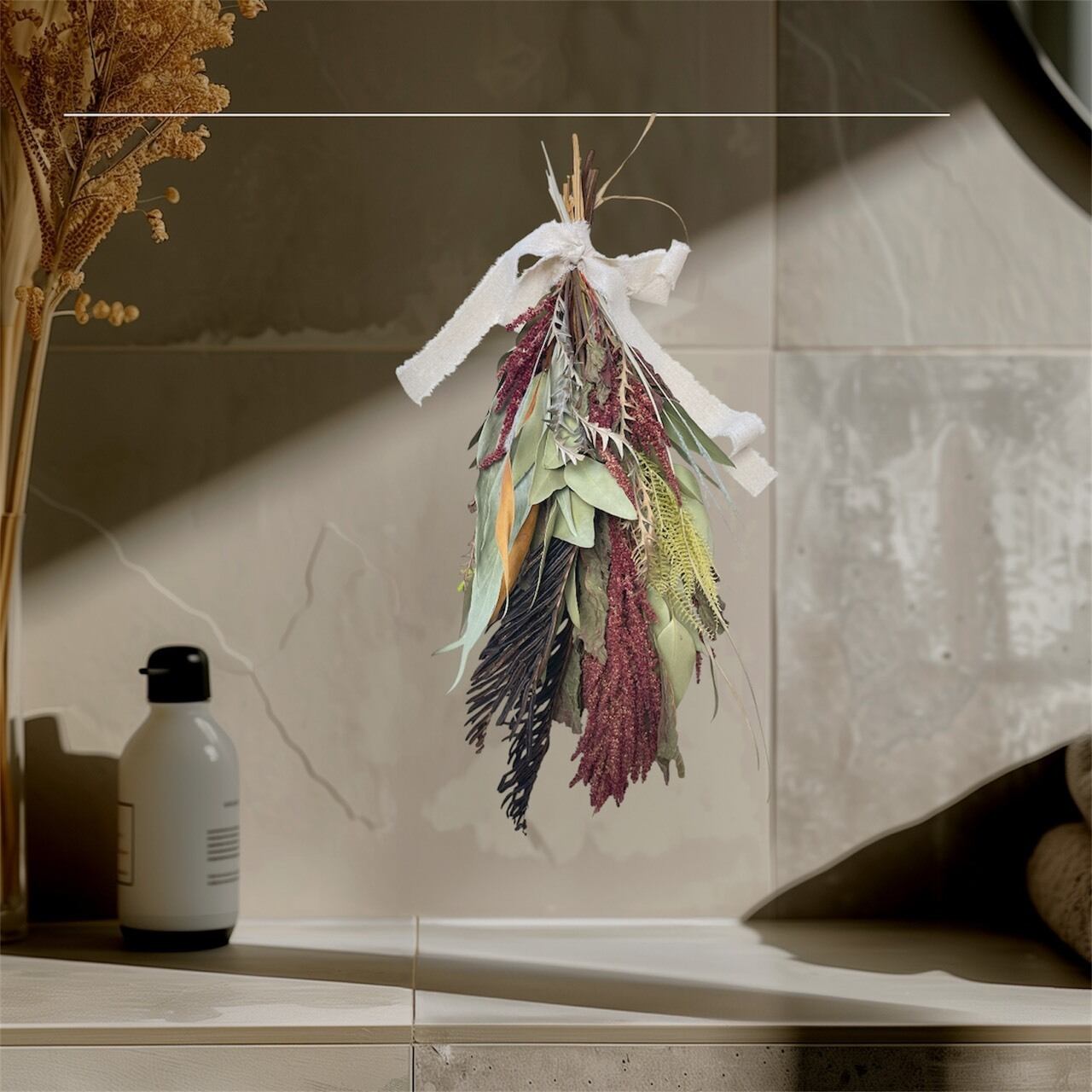 風になびくような動きのある葉先と、深いボルドーのコントラストが美しいスワッグです。