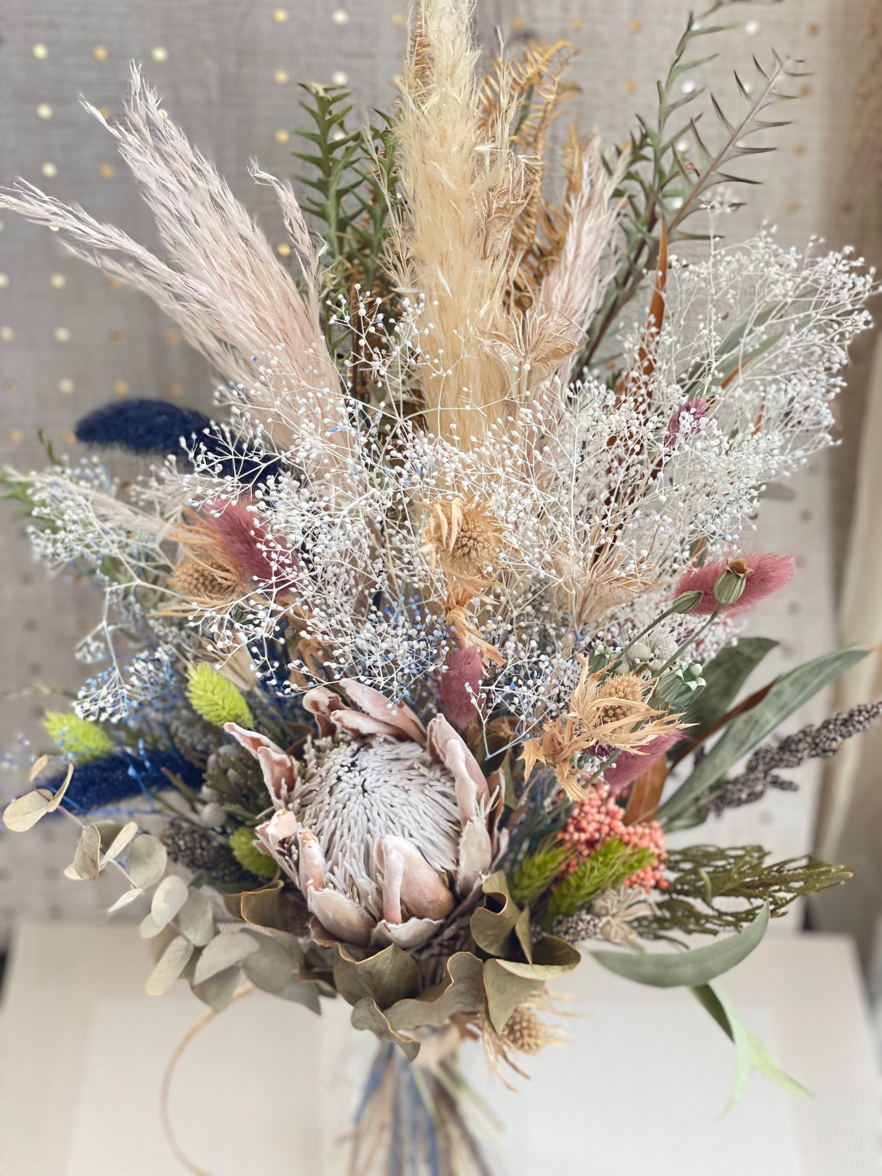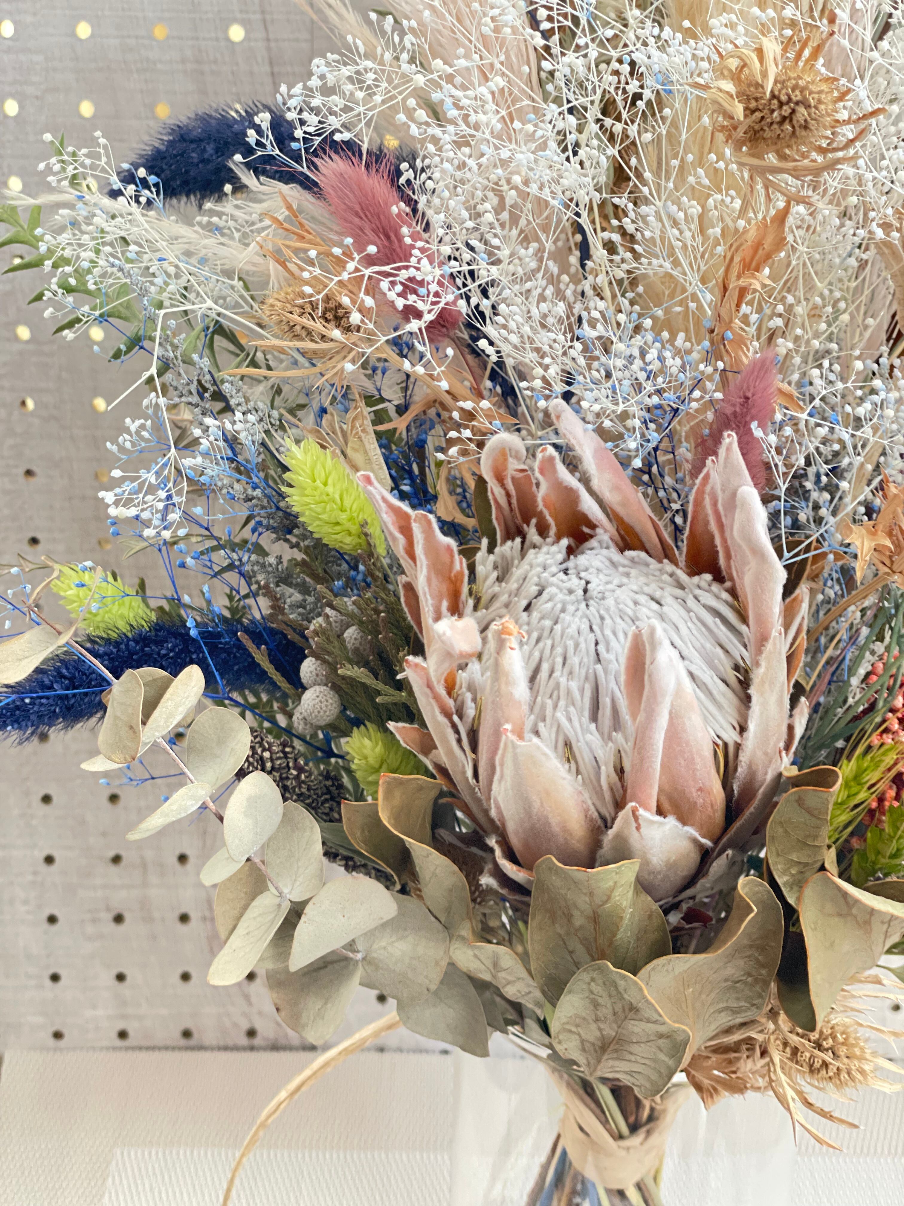 *キング・プロテア、かすみそう(白ラメ)、かすみそう(青/白)、ラグラス、バンクシア(葉)、テールリード(ピンク)、ニゲラオリエンタル、エリンジウム、ボアプランツ、グレビレア、シルバーブルテア、ライスフラワー、造花(リーフ)